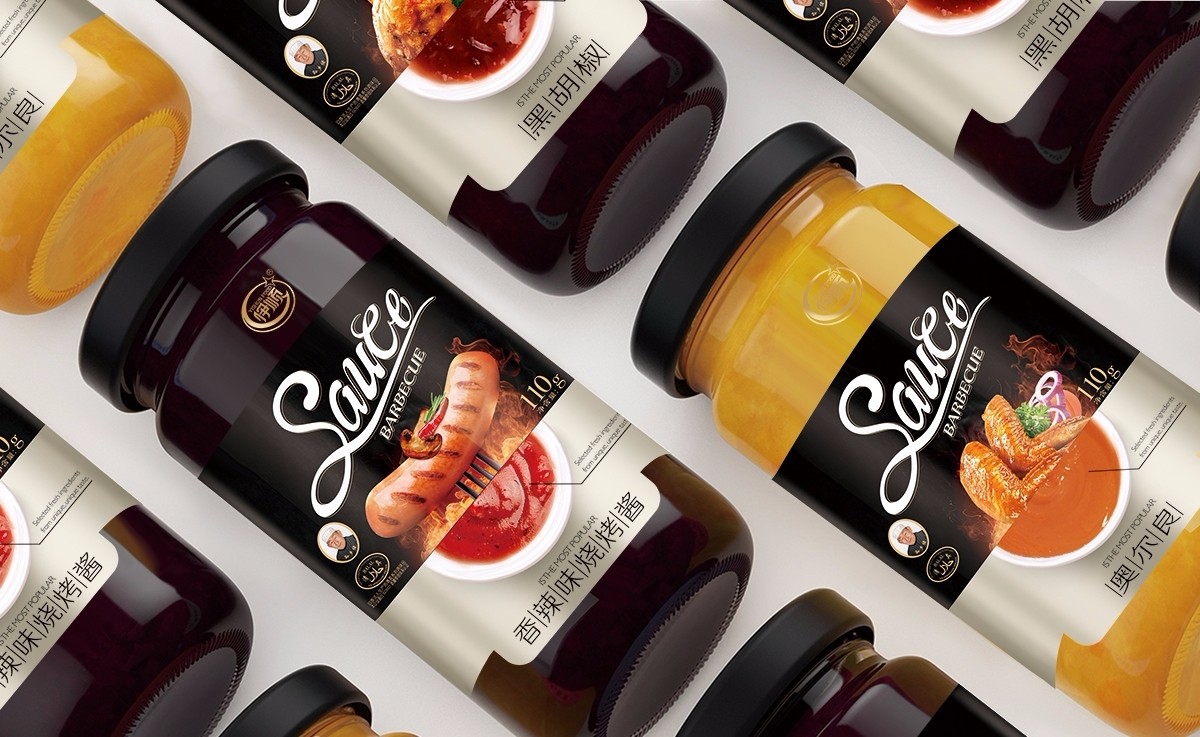 在酱料的产品包装上,整体采用以黑色为主。黑色主调搭配食材对应的酱料,以达到视觉效果冲击,凸显产品高端上档。在货架上出类拔萃,品质出众。在区隔同类产品的同时,提升消费者对产品的好感度。